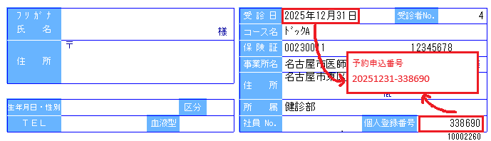 健診予約申込フォーム(受診歴あり) 当センターを過去にご利用いただいたことがある方専用の申込ページです。 予約申込番号をお持ちの方、当センターの結果報告書をお持ちの方がご利用できます。 予約申込番号は一部のご案内に記載しております。お持ちの方はそちらをご入力ください。 健診結果報告書をお持ちの方は、そこに記載のある受診日・個人登録番号をご入力いただくことで申込出来ます。 (結果報告書・サンプル画像) ※一部の結果報告書には当センターの個人登録番号の記載がないものがあります。その場合はお電話でお申込みください。 お申込み頂いた後の流れは以下の通りです。 Step1:申込受付メール(自動返信) Step2:担当より連絡(メールor電話) Step3:予約確定 Step4:事前案内送付(1~2週間前までに) この申込みで予約が確定されるものではありません。本ページでお申込み後、3営業日以内にこちらから連絡致します。もし連絡がない場合は、大変お手数ですがお電話を頂けますようお願い申し上げます。 連絡先電話番号:052-937-8425 平日: 9:00~17:00 土曜: 9:00~12:00 必須予約申込番号 20250401-9999999 - 必須漢字氏名 (例)健診 太郎 必須カナ氏名 (例)ケンシン タロウ 必須メールアドレス (例)kenshin@kenshin_center.com 必須メールアドレス(確認用) (例)kenshin@kenshin_center.com 必須電話番号(日中連絡先) (例)052-937-8425 必須性別 ---男性女性 必須生年月日 ---1920/大正9年1921/大正10年1922/大正11年1923/大正12年1924/大正13年1925/大正14年1926/大正15年1926/昭和元年1927/昭和2年1928/昭和3年1929/昭和4年1930/昭和5年1931/昭和6年1932/昭和7年1933/昭和8年1934/昭和9年1935/昭和10年1936/昭和11年1937/昭和12年1938/昭和13年1939/昭和14年1940/昭和15年1941/昭和16年1942/昭和17年1943/昭和18年1944/昭和19年1945/昭和20年1946/昭和21年1947/昭和22年1948/昭和23年1949/昭和24年1950/昭和25年1951/昭和26年1952/昭和27年1953/昭和28年1954/昭和29年1955/昭和30年1956/昭和31年1957/昭和32年1958/昭和33年1959/昭和34年1960/昭和35年1961/昭和36年1962/昭和37年1963/昭和38年1964/昭和39年1965/昭和40年1966/昭和41年1967/昭和42年1968/昭和43年1969/昭和44年1970/昭和45年1971/昭和46年1972/昭和47年1973/昭和48年1974/昭和49年1975/昭和50年1976/昭和51年1977/昭和52年1978/昭和53年1979/昭和54年1980/昭和55年1981/昭和56年1982/昭和57年1983/昭和58年1984/昭和59年1985/昭和60年1986/昭和61年1987/昭和62年1988/昭和63年1989/昭和64年1989/平成元年1990/平成2年1991/平成3年1992/平成4年1993/平成5年1994/平成6年1995/平成7年1996/平成8年1997/平成9年1998/平成10年1999/平成11年2000/平成12年2001/平成13年2002/平成14年2003/平成15年2004/平成16年2005/平成17年2006/平成18年2007/平成19年2008/平成20年2009/平成21年2010/平成22年2011/平成23年2012/平成24年2013/平成25年2014/平成26年2015/平成27年2016/平成28年2017/平成29年2018/平成30年 ---1月2月3月4月5月6月7月8月9月10月11月12月 ---1日2日3日4日5日6日7日8日9日10日11日12日13日14日15日16日17日18日19日20日21日22日23日24日25日26日27日28日29日30日31日 必須保険証情報 保険者番号・記号・番号 ---前回と同じ前回から変更あり※前回から変更ある方は、保険証情報をご入力ください。 ※ご入力ください 必須保険者番号 (例)01230010 必須記号 (例)72210743 必須番号 (例)30 必須本人家族区分 ---本人配偶者家族※保険証の情報はマイナポータル等をご確認し、ご入力ください。 必須送付先住所 ---前回と同じ前回から変更あり※前回から変更ある方は、住所をご入力ください。 ※前回住所が不安な方は、変更ありを選択してご入力ください。 ※ご入力ください 必須郵便番号(例)4610004 必須住所1 ※市区町村・番地まで 任意住所2 ※マンション名・部屋番号等(書類の誤送付防止のため入力をお願いします) 必須受診希望コース ---前回と同じコース前回と異なるコース※異なるコースをご希望の方は詳細をご入力ください。 ※前回コースが不明な方は、異なるコースを選択してご入力ください。 ※ご入力ください 必須希望コース名称 ※内容がわかるように、どの健保のどのコースかをご記入ください。 (例1)名古屋市国民健康保険の補助を利用、特定健診 (例2)協会けんぽの補助を利用、一般健診 (例3)医師国保の補助を利用、人間ドック (例4)全額自己負担で、人間ドック 必須追加希望オプション ---前回と同じ内容前回と異なる内容を希望追加を希望しない※前回と同じ内容を選択いただいた方は、追加の有無も併せて前回と同じでご予約承ります。 ※前回と同じ内容でも追加したオプションは、予約完了時のメールでお知らせいたします。 ※前回と異なる内容での申込を希望される方は、前回の内容も含めて全ての内容をご入力ください。 ※ご入力ください 必須受診希望オプション オプション一覧(PDF) 脳ドック(¥30,800)肺ドック(¥18,150)腫瘍マーカーセット(¥7,260)甲状腺検査(¥4,950)マンモグラフィ / 30歳以上(¥5,500)乳腺エコー(¥5,500)子宮頚がん検査(¥5,500)胃内視鏡(経口) / 胃X線から変更(¥5,500)胃内視鏡(経鼻) / 胃X線から変更(¥5,500)内臓脂肪量(¥3,300)骨密度(¥1,925)動脈硬化検査(¥3,850)心臓検査(¥12,650)DWIBSドック(¥44,000) 任意そ